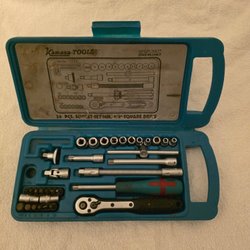 Verktygssats i röd verktygslåda. Innehåller hylsor, förlängare, spärrhandtag och annat.