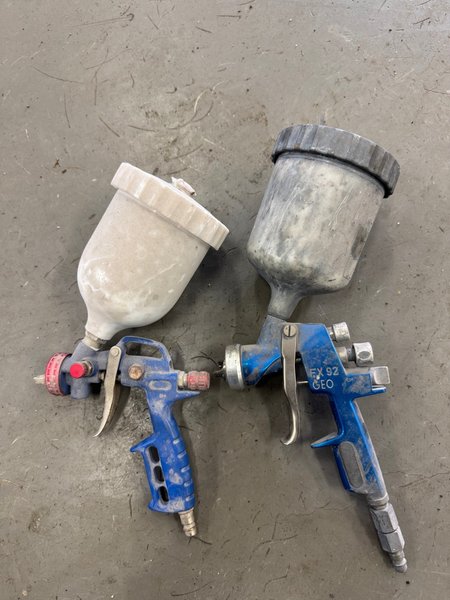 Två färgsprutor med överliggande behållare. En spruta är märkt FX 92 GEO.