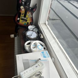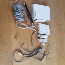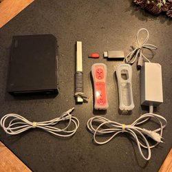 Nintendo Wii konsol med tillbehör. Inkluderar strömadapter, AV-kabel, sensor bar, Wii Remote och Nunchuck.
