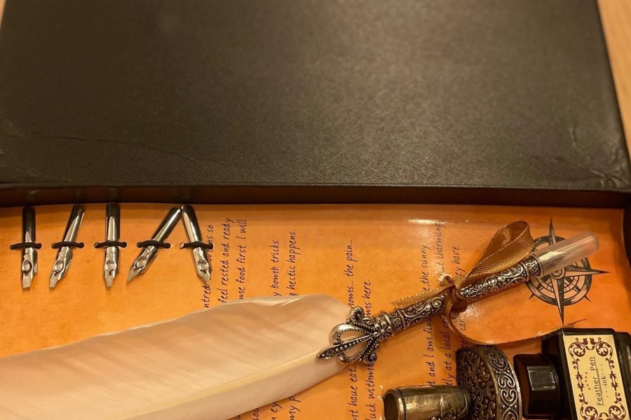 Fjäderpenna med bläck, pennställ och 5 olika ”uddar”. Använd en gång.