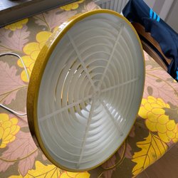 En charmig retro taklampa i en härlig gul färg. Made in Italy. Lampan har en distinkt design med perforerad detalj och en klassisk form som passar perfekt i ett vintage-inspirerat hem. Den ger ett behagligt och stämningsfullt ljus. Typ som en klassisk lampa att ha över köksbordet. Jag har haft den i ett barnrum som taklampa. (Har då fäst upp den med ståltråd). Funktionen att dra den upp och ner fungerar inte . Den blir inte uppe av sig själv längre, då den har många år på nacken. Kan enkelt fästas i läget man önskar med ståltråd. Annars mycket fint skick, någon enstaka skav, se bild. Mått 40 cm i diameter. Höjd 25 cm.