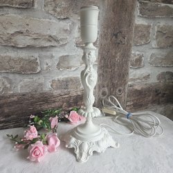 En bordslampa med en svart fot och en vit lampskärm. Lampan har en sladd med strömbrytare.