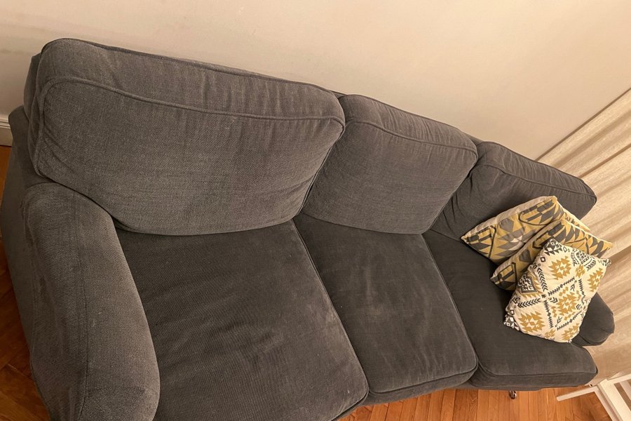 Soffa med tre sittplatser i mörkgrått tyg. Soffan har breda armstöd och lösa ryggkuddar. Sittdynorna är också lösa.