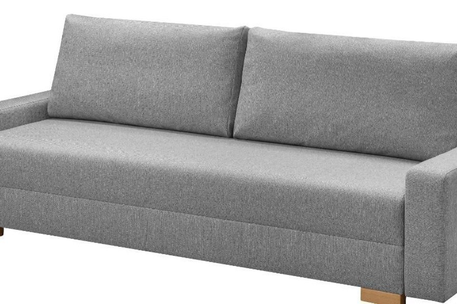 Bäddsoffa i grått tyg med träben. Soffan har två ryggkuddar och raka armstöd.