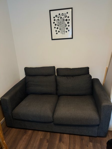 Soffa med två sittplatser. Klädsel i mörkgrått tyg. Avtagbara dynor i rygg och sits.