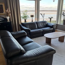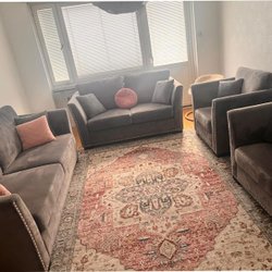 Soffgrupp i grått tyg. Perfekt för vardagsrummet. Bekväm och stilren design.