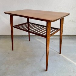 Soffbord i teak med avsmalnande ben. Bordet har en rektangulär form med rundade hörn. Mått: 60 cm långt, 40 cm brett och 48 cm högt.