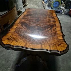 Soffbord i trä med en kvadratisk bordsskiva och böjda ben. Bordet har en mörk träfärg och en klassisk design.