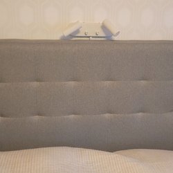 Vit sänggavel med ribbad design och en träfärgad kant upptill. Passar till 180 cm säng.