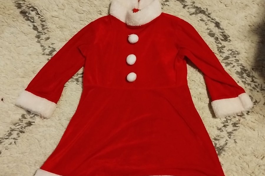 Röd klänning med vit krage och vita detaljer vid ärmslut och nederkant. Klänningen har tre dekorativa vita bollar framtill.