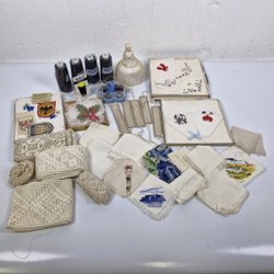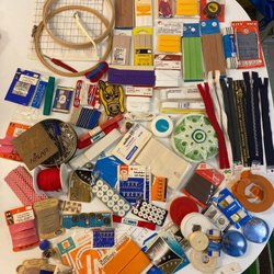Sytillbehör, flera nålbrev resårband för skärp, spännen till skärp, 2 olika muddar till ärmar, ett par svarta med pärlor, ett par gröngula, helt oanvända. Säkerhetsnålar och ett minibroderi med hästhuvuden samt band för handdukshängare m.m. Tre olika reseetuier med nålar, säkerhetsnål och tråd.