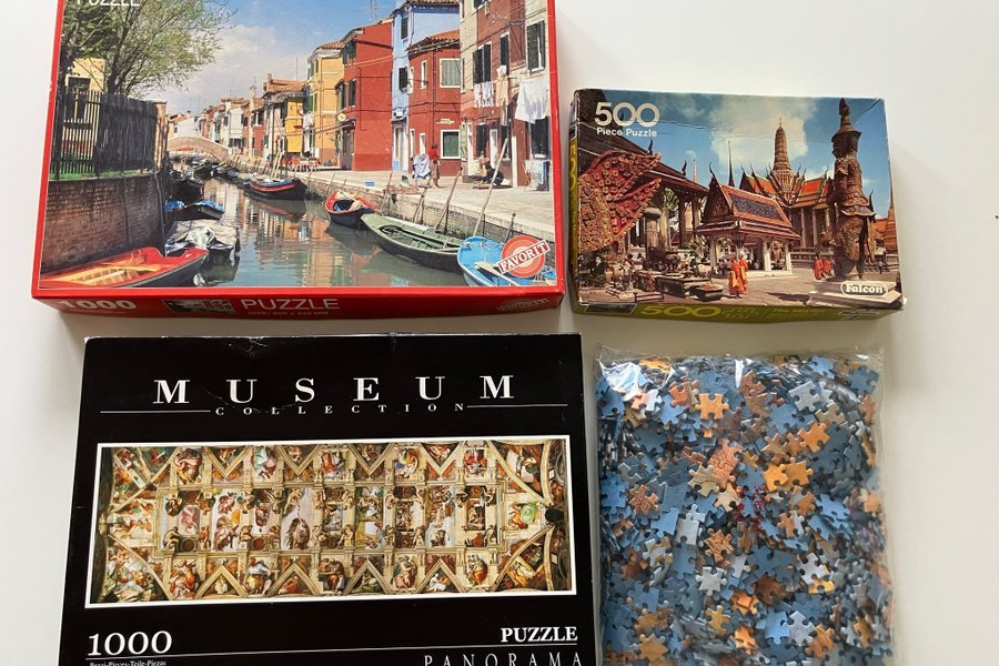 1 st med 500 bitar som också var längesen jag byggde, men förutsätter att alla bitar finns. Kartongerna har varit med om ett par flyttar, så har fått lite stryk. Men som du ser på bilden så är det inga problem att se motiven.