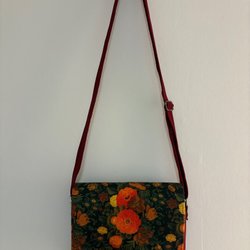 Brun väska med justerbar axelrem och dekorativa detaljer. Väskan har ett lock som stängs med en rem och ett spänne.
