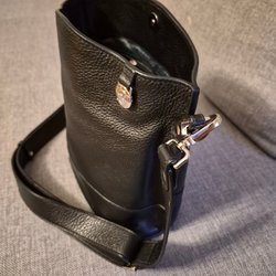 Beige/rosa väska med silvriga detaljer. Fyra fack, från Gina. Baksidan lätt avfärgad av svart jacka, syns ej när väskan används.