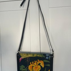 En söt liten väska med ett blommigt mönster i varma toner. Väskan har en flik med en dekorativ knapp och fransar nedtill. Axelremmen är gjord av ett tvinnat snöre i matchande färger. Insidan är fodrad med ett svart tyg och har en liten ficka med dragkedja.