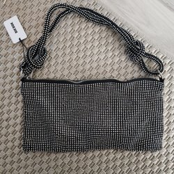 En ljusblå axelremsväska täckt med strass. Väskan har ett handtag och stängs med dragkedja.
