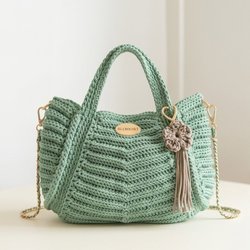 Handgjord rosa väska med guldfärgad kedja. Väskan har ett vackert virkat mönster och ett hjärtformat lås.
