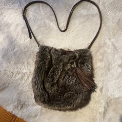 Brun axelremsväska med fransar och flera fack. Väskan har en justerbar axelrem och stängs med en knapp. Det finns även en dragkedja på insidan.