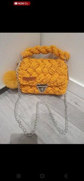Handgjord väska i en flätad design med ett silverfärgat kedjeband och ett dekorativt hänge. Väskan har ett unikt utseende och är ett riktigt blickfång.