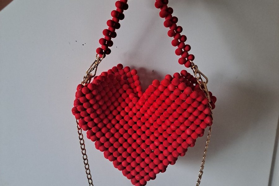 Röd hjärtformad väska med pärlor och guldfärgad kedja. Väskan har ett handtag av röda pärlor.