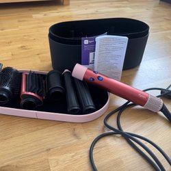 Alla originaltillbehör medföljer, inklusive förvaringsbox samt olika stylingmunstycken såsom locktänger, borstar och fönmunstycke.