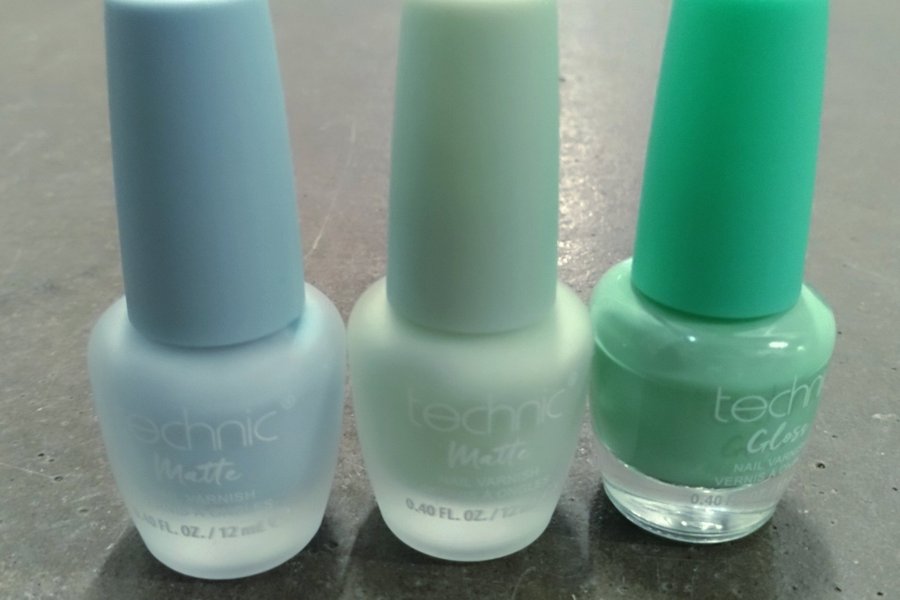 Tre nagellack från Technic i olika nyanser av grönt och blått. Två är matta och en är gloss.