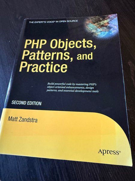 Boken "PHP Objects, Patterns, and Practice" av Matt Zandstra är en andra upplaga som fokuserar på att bygga kraftfull kod genom att behärska PHP:s objektorienterade förbättringar, designmönster och viktiga utvecklingsverktyg.