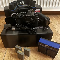 Olympus E-500 digitalkamera med to objektiver: Zuiko Digital 14-45mm 1:3.5-5.6 og Zuiko Digital 40-150mm 1:3.5-4.5. Der medfølger også en modlysblænde, kamerarem, batteri og oplader.