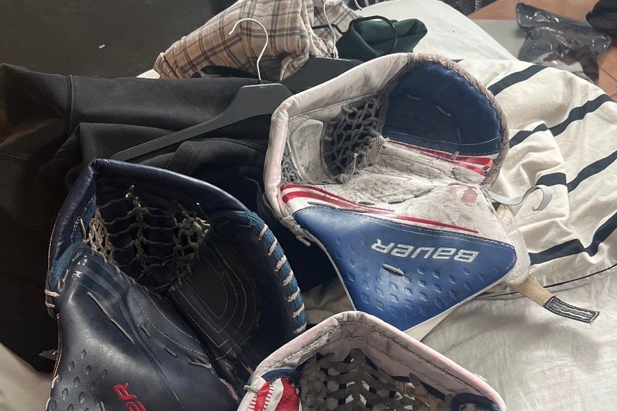 Ett par Bauer målvaktshandskar i blått, vitt och rött. Handskarna är designade för ishockeymålvakter.