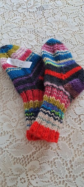 Ett par handstickade sockor i olika färger. Storleken är uppskattad till 25-27.