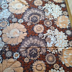 Retro, vintage gardinlängd, 70- tals. Stort blommigt motiv i orange, grönt och brunt på naturvita botten