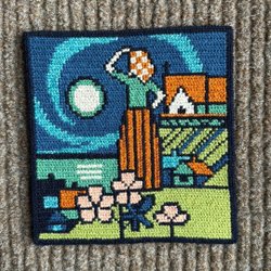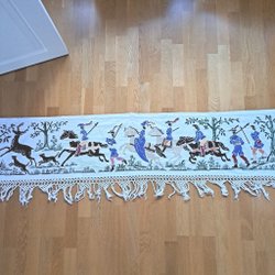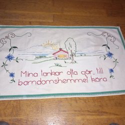 Handbroderad vacker bonad med texten: "Min tanke än så gärna går till barndomshemmet kära". Den är ofållad så det får köparen göra, eller kan ju sättas i glas o ram om man vill. Mått 68 x 47 cm. Köparen betalar frakten.