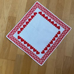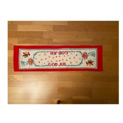 En broderad jultavla. Broderad med rött garn på linnefärgad väv.