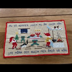 En charmig julbonad med ett motiv av tomtar i full färd med julförberedelser. Perfekt för att skapa en mysig julstämning i hemmet.