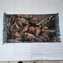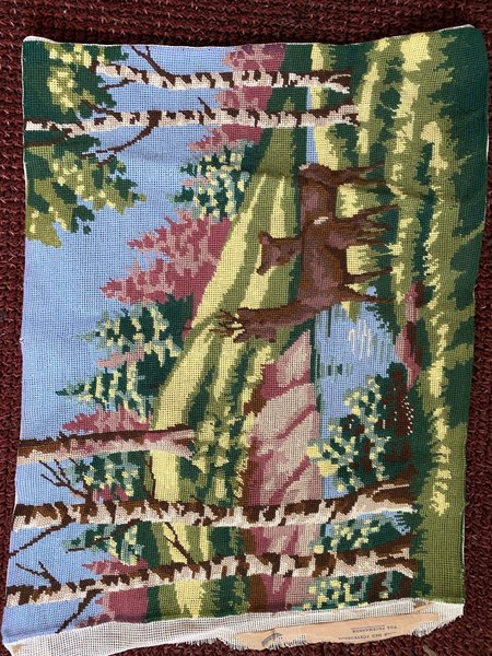 En gobeläng med ett motiv av en skog och ett rådjur. Sydd med petit pois. Saknar ram. Mått 58 cm bred och 47 cm hög