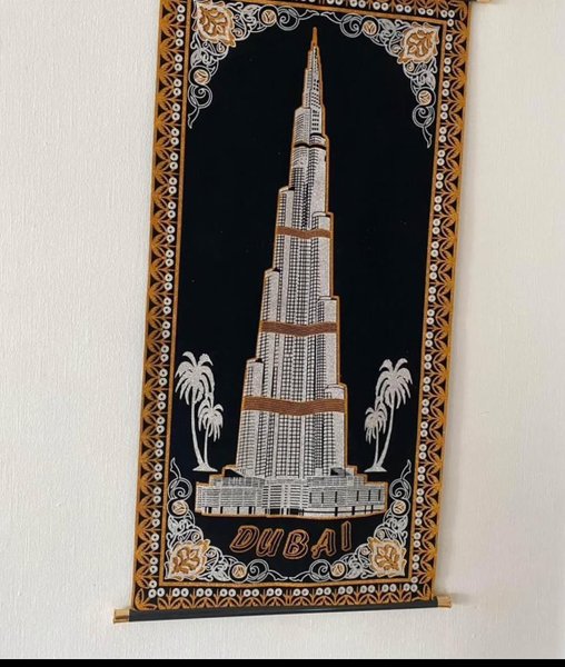 Dekorativ väggbonad med motiv av en känd byggnad i Dubai och palmer. Den har en detaljerad broderad design med en dekorativ kant. Tyget är silkes/sammet. Knappt använd och väldigt bra skick. Hör av dig vid intresse!