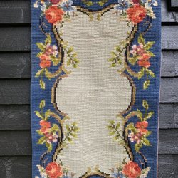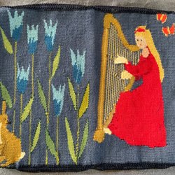 Vacker gobeläng med motiv av en tjäder i ett landskap med träd och solnedgång. Baksidan är i svart tyg och har en ring för upphängning.