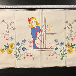 En väggbonad med motiv av en pojke, gäss, en väderkvarn och ett hus. Den har fransar nedtill.Nils Holgersson.
