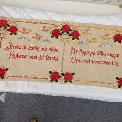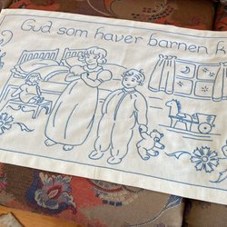 En söt handbroderad bonad med flicka och pojke. I använt skick, slitningar och fläckar finns. Se bilder. Mäter 84x47 cm.