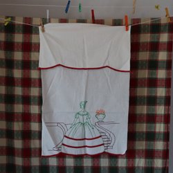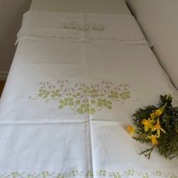 Maskinbroderad paradhandduk i polyester. Vit botten med klarblått mönster, spets i nedre kanten på överhänget. Bredd: 50cm. Längd: 82 cm.