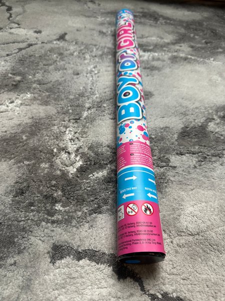 Konfettikanon som skjuter rosa papper. Drivs med tryckluft. Perfekt för babyshower eller liknande tillställningar.