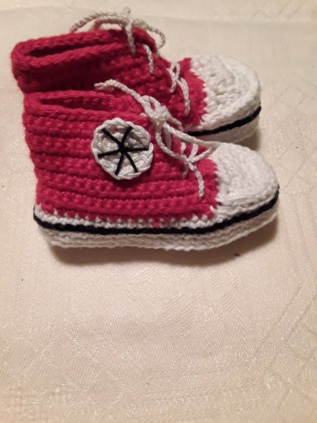 Handgjorda virkade babyskor i rött och vitt med vita skosnören. Skorna har en svart rand runt sulan och en vit cirkulär detalj med svarta linjer på sidan. Sulans längd 11 cm . Dessa är virkade i bomullsgarn.