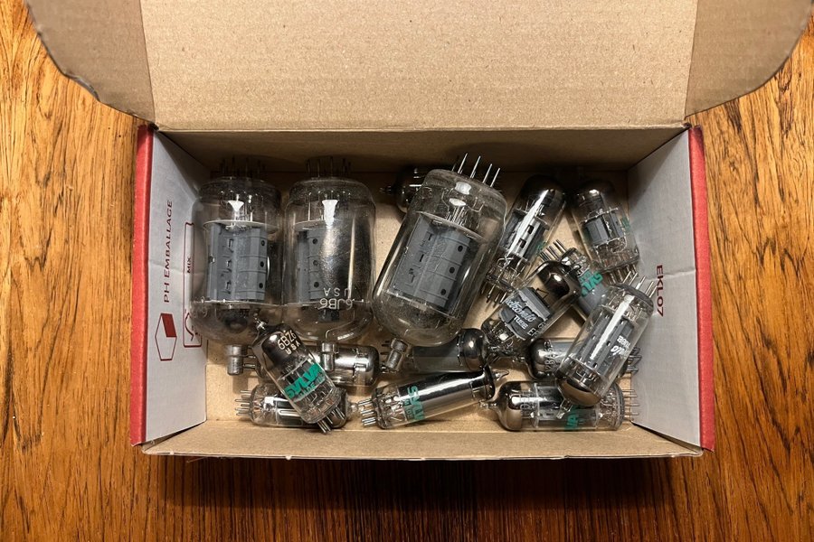 Elektronrör i låda av olika typer. Inget funktionstestat. Säljes som det är!