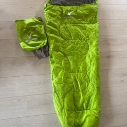 Svart och turkos sovsäck med tillhörande packpåse. Perfekt för camping och utomhusaktiviteter.