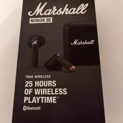 Laddningsfodral för Marshall Minor III hörlurar tillsammans med den vänstra hörluren. Fodralet har en texturerad svart yta med Marshall-logotypen i vitt. Laddningsporten är av USB-C-typ.