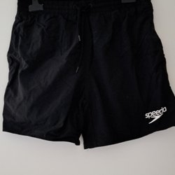 Ett par mörkblå badshorts med resår i midjan och dragsko för justering. Shortsen har fickor i sidorna och en bakficka.