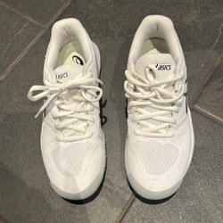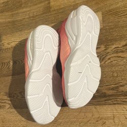 Ett par vita träningsskor med vita skosnören. Skorna har en grå detalj runt vristen och en rosa insida.