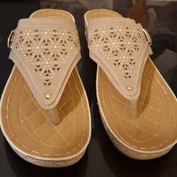Ett par eleganta sandaler från Clou. Sandalerna har två remmar över foten som är dekorerade.