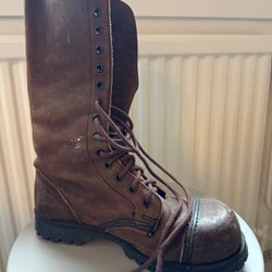 Underground kängor med stålhätta fram. Ett par använda kängor i vinröd färg. Snörningen framtill ger en justerbar passform.