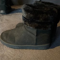 Ett par svarta kängor med snörning och fuskpäls upptill. Kängorna har en robust sula och texten "SOFTSHELL" tryckt på sidan.